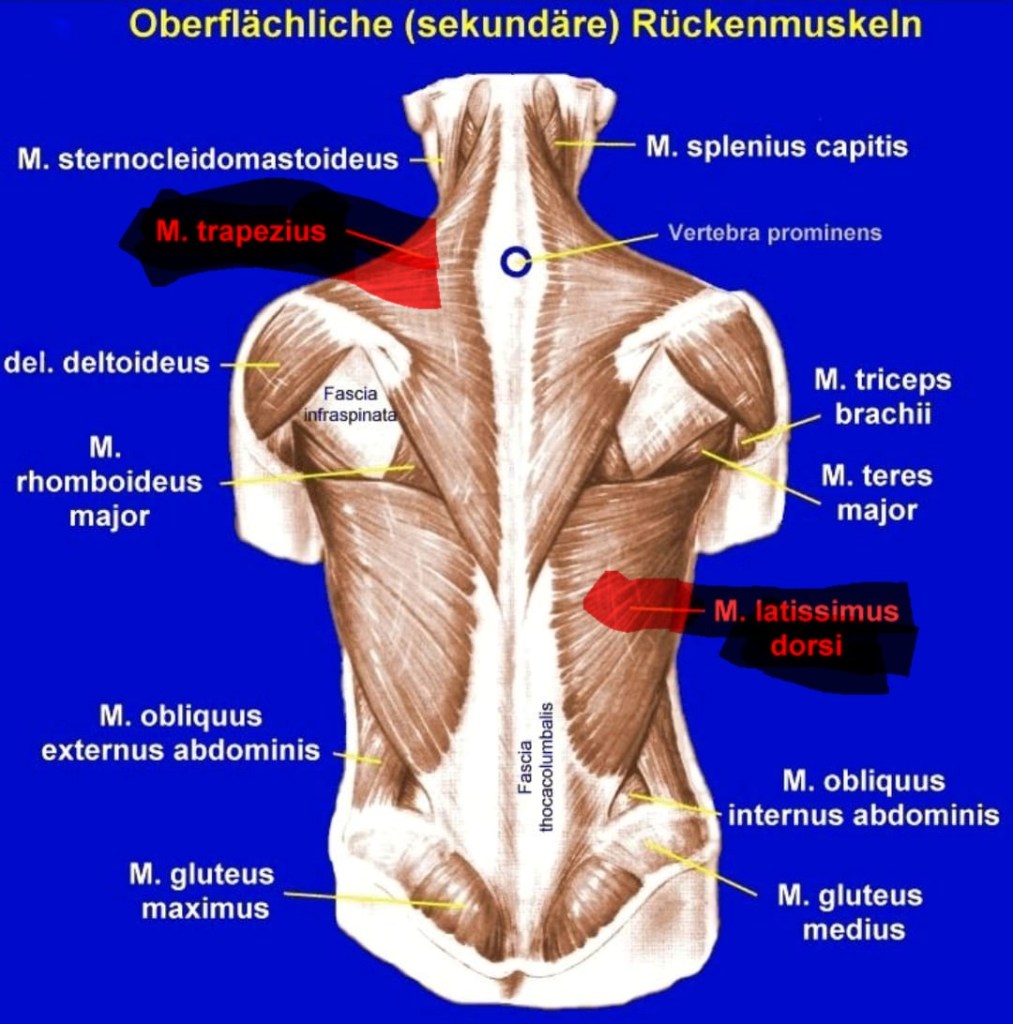 Als Teil der exspiratorischen Atemhilfsmuskulatur unterstützt der Musculus latissimus dorsi („Hustenmuskel“) beim heftigen Atmen die Entleerung der Lunge. Und genau da liegt seit je her mein Problem. Ich bin gefühlt, Dauer erkältet, da meine Lunge immer verschleimt ist, denn ich kann nicht abhusten. Was bedeutet, wenn die Erkältung stärker wird, ist jede Erkältung bei mir eine potenzielle Lungenentzündung.